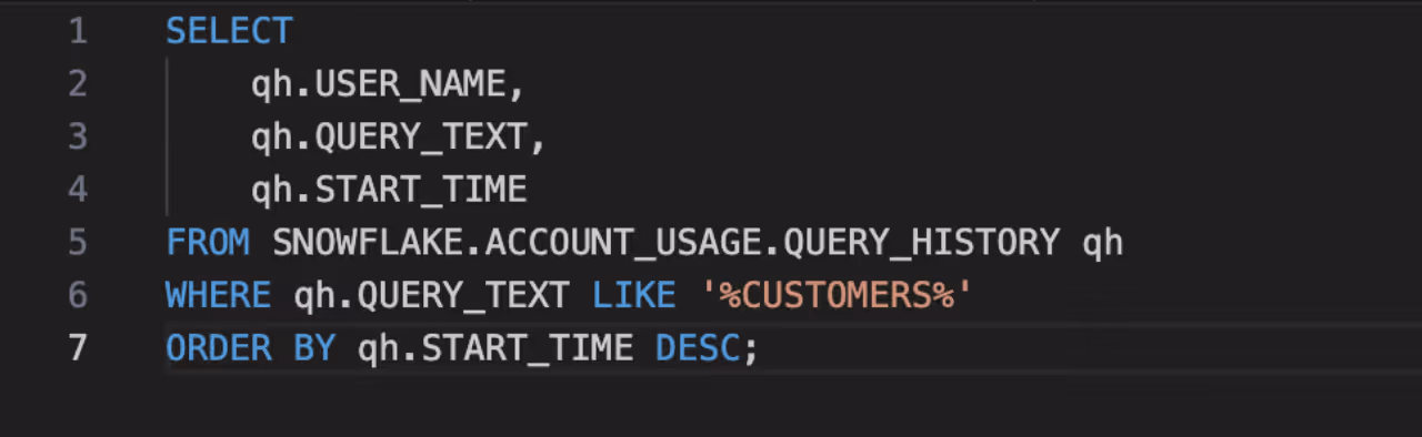 - ACCOUNT_USAGE.QUERY_HISTORY → Captures query details, enabling you to follow transformation steps.